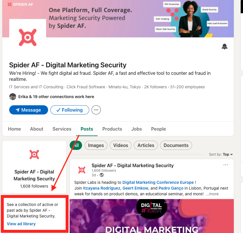 You may also begin from a competitor’s LinkedIn page if you already know the brand you want to research. However, the best practice is to use the company page as a starting point only, then move into LinkedIn Ad Library for actual ad research. That approach is more consistent with LinkedIn’s current setup, especially since the older Page-level Ads filter was removed.