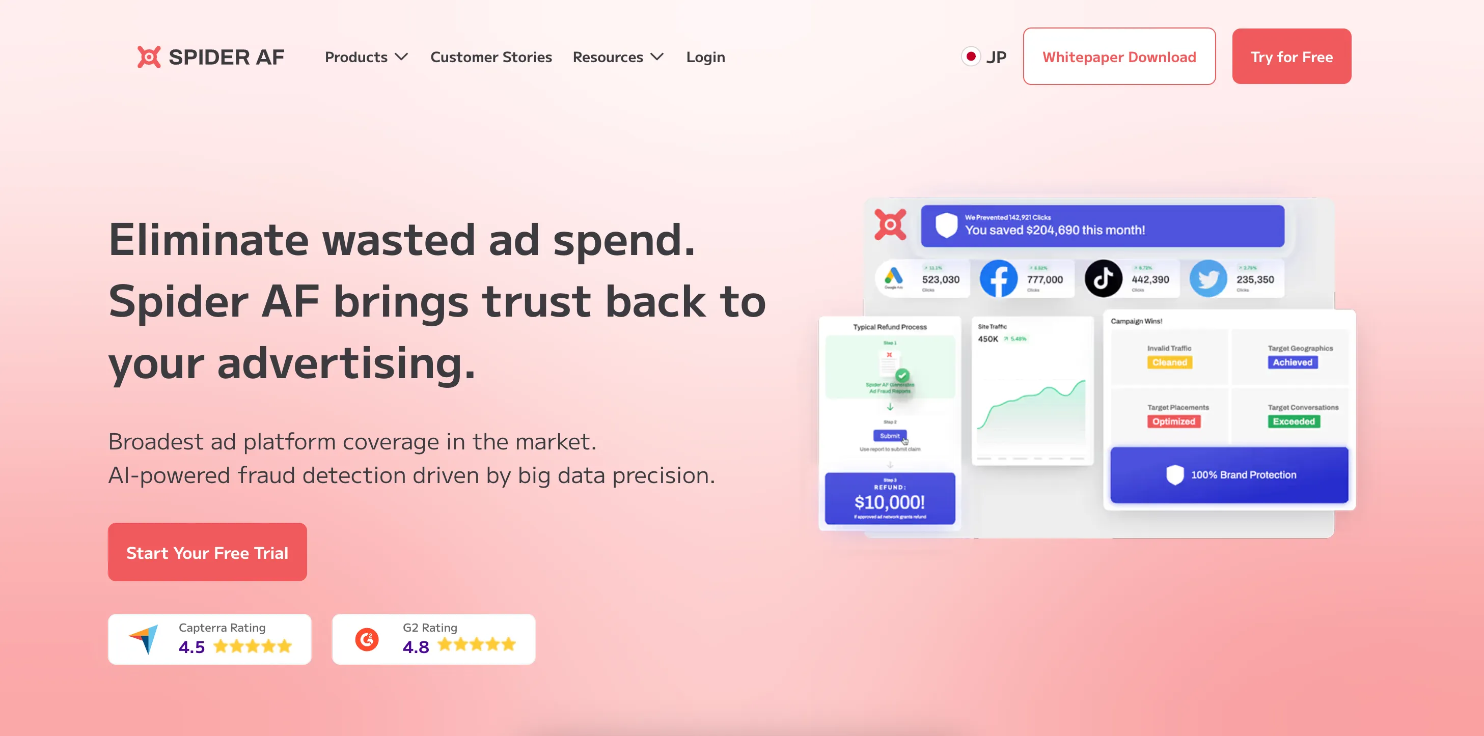 A través de docenas de historias de clientes, Spider AF informa un promedio 25—40% de mejora en ROAS neto una vez que se eliminan los clics no válidos, lo que se traduce en un presupuesto tangible que puede reinvertirse en canales de crecimiento en lugar de en defensa contra el fraude.